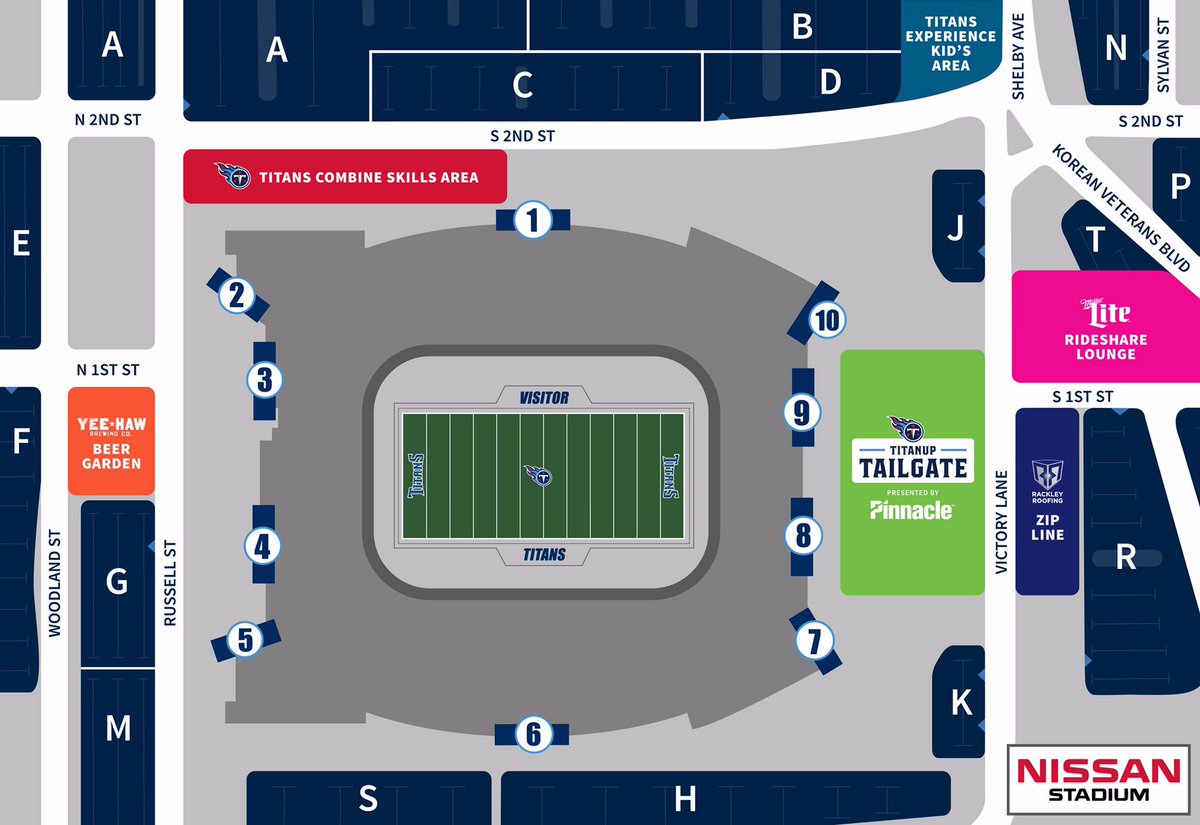 Nissan Stadium Gate Map – Maps show where some of those alternative lots are Bike racks are available across the street from Gates 6 and near Lot T. Nissan Stadium is not responsible for lost or stolen bikes. Electric . Nissan Stadium has been home to the Tennessee Titans since the 1999 NFL season. From the โMusic City Miracleโ to the comeback against the New York Giants in 2006 to the walk-off against the Arizona .
